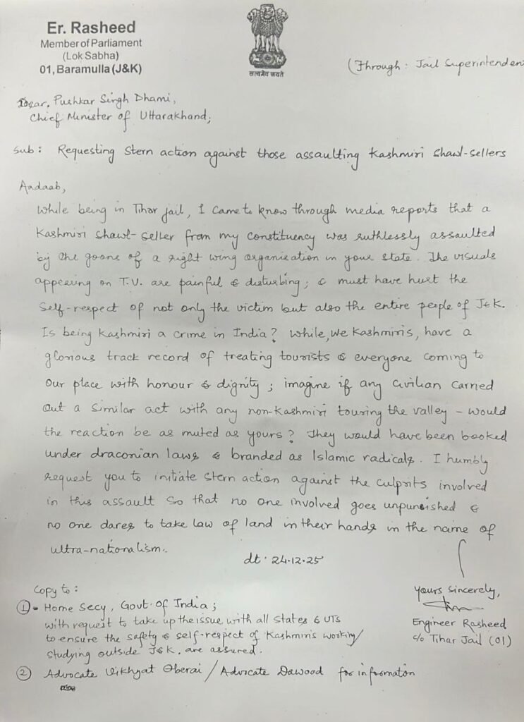 In both letters, Jailed MP Er Rashid categorically demanded strict and exemplary action against the culprits so that no one dares to take the law into their own hands in the name of ultra-nationalism. He also urged the state governments to ensure the safety, dignity and livelihood of Kashmiri traders working outside Jammu and Kashmir. Copies of the letters, he added, have also been marked to the Union Home Secretary, seeking intervention to safeguard Kashmiris studying or earning their livelihood across the country.