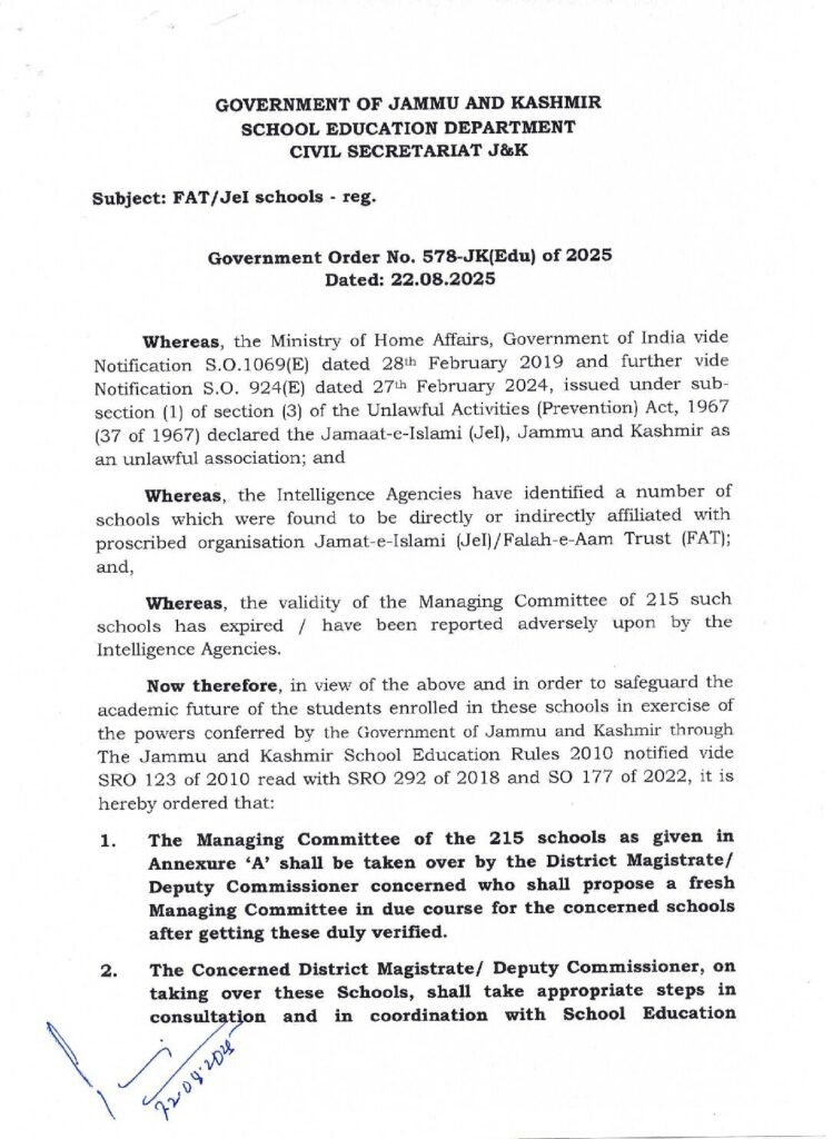According to Government Order No. 578-JK(Edu) of 2025, the decision follows adverse reports from intelligence agencies which identified these schools as directly or indirectly linked with the banned outfit. The validity of their existing managing committees had either expired or was reported negatively, officials said.
